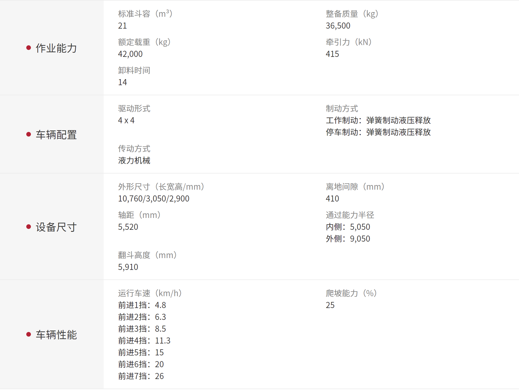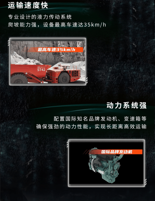 - ST42应用先进的动力传动技术,采用国际知名品牌发动机,整车动力强劲,系统稳定可靠,适应更多矿区作业工况;- 快速响应操作,缩短倾倒矿物时间,提升作业效率;- 驾驶室符合ROPS/FOPS标准,保障驾驶安全;- 整车采用高品质结构钢材料,货箱使用高强度耐磨钢及加强设计,让整车更经久耐用;- 车辆均支持视距遥控、远程驾驶、智能碰撞预警、盲区监测、车辆监控、驾驶员疲劳监测等多种智能化系统灵活选配。